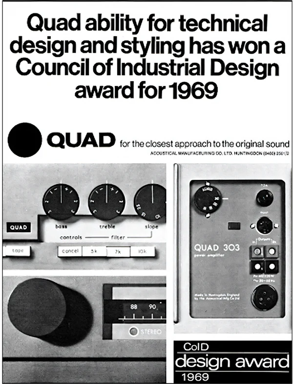 Amplificatorul de putere QUAD 303 a fost destinat uzului casnic normal cu difuzoare cu eficienta moderata, dar a fost folosit si de studiourile de difuzare si inregistrare din intreaga lume, care i-au apreciat performanta si fiabilitatea excelente. Etosul nu a deviat. Modelul original 33 si partenerul sau 303 au fost premiati cu un „Premiul pentru design industrial al Consiliului in 1969”. Chiar si astazi, designul original este sarbatorit si confirmat de prezenta sa la Muzeul de Arta Moderna din New York. Noile modele 33 si 303 au fost proiectate industrial pentru a depasi acele standarde originale, cu un aspect si o functionalitate cu adevarat moderne | |