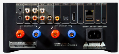 C 700 dispune de doua perechi de intrari analogice RCA, precum si de intrari coaxiale si optice, pentru conectarea de CD playere, console de jocuri, adaptoare media si alte componente. Exista de asemenea si un port HDMI-eARC pentru conectarea la un HDTV cu suport HDMI-ARC. Acest lucru permite setarii de volum sa fie reglate de telecomanda TV-ului.