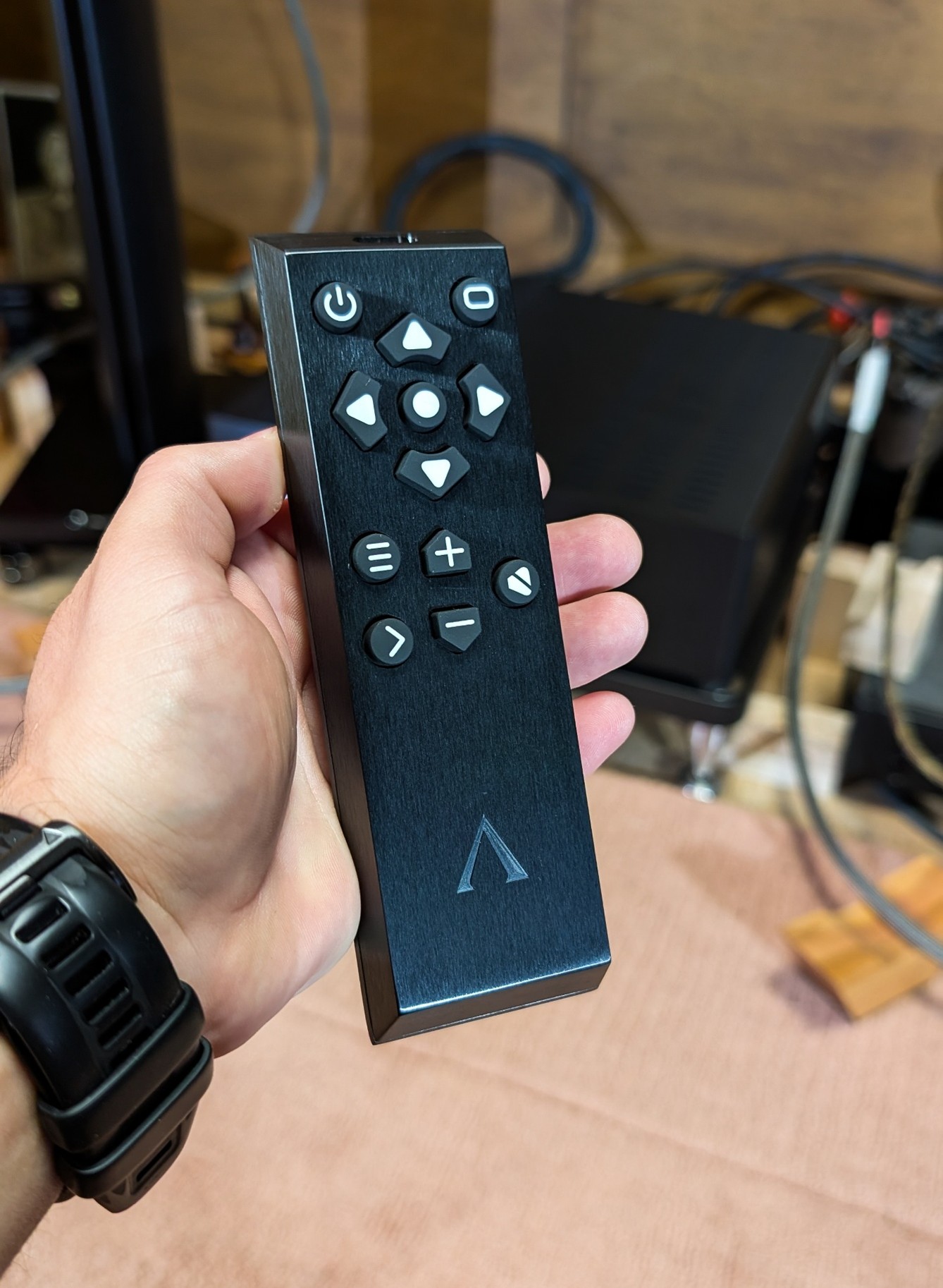 Trecând mai departe la ce am experimentat, primul lucru care m-a impresionat a fost ergonomia total diferită a modului în care operezi cu Mimas, dacă de la alte amplificatoare integrate suntem învățați în general cu două selectoare rotunde, una pentru input și una pentru volum, în cazul Mimas lucrurile stau cu totul diferit. Spre exemplu, volumul este operat prin apăsarea în stanga sau în dreapta display-ului, Mimas dispunând de o tehnologie ce utilizează un control de volum cu 88 pași de 1 dB realizat cu rezistoare cu folie metalică și toleranță 1%, similar cu cel folosit în modelul de top Calypso. Până și meniul de configurare al aparatului este diferit față de ce am văzut până acum, mi-a luat câteva minute bune să mă acomodez cu el și recunosc că am apelat la manualul de utilizare la un moment dat.