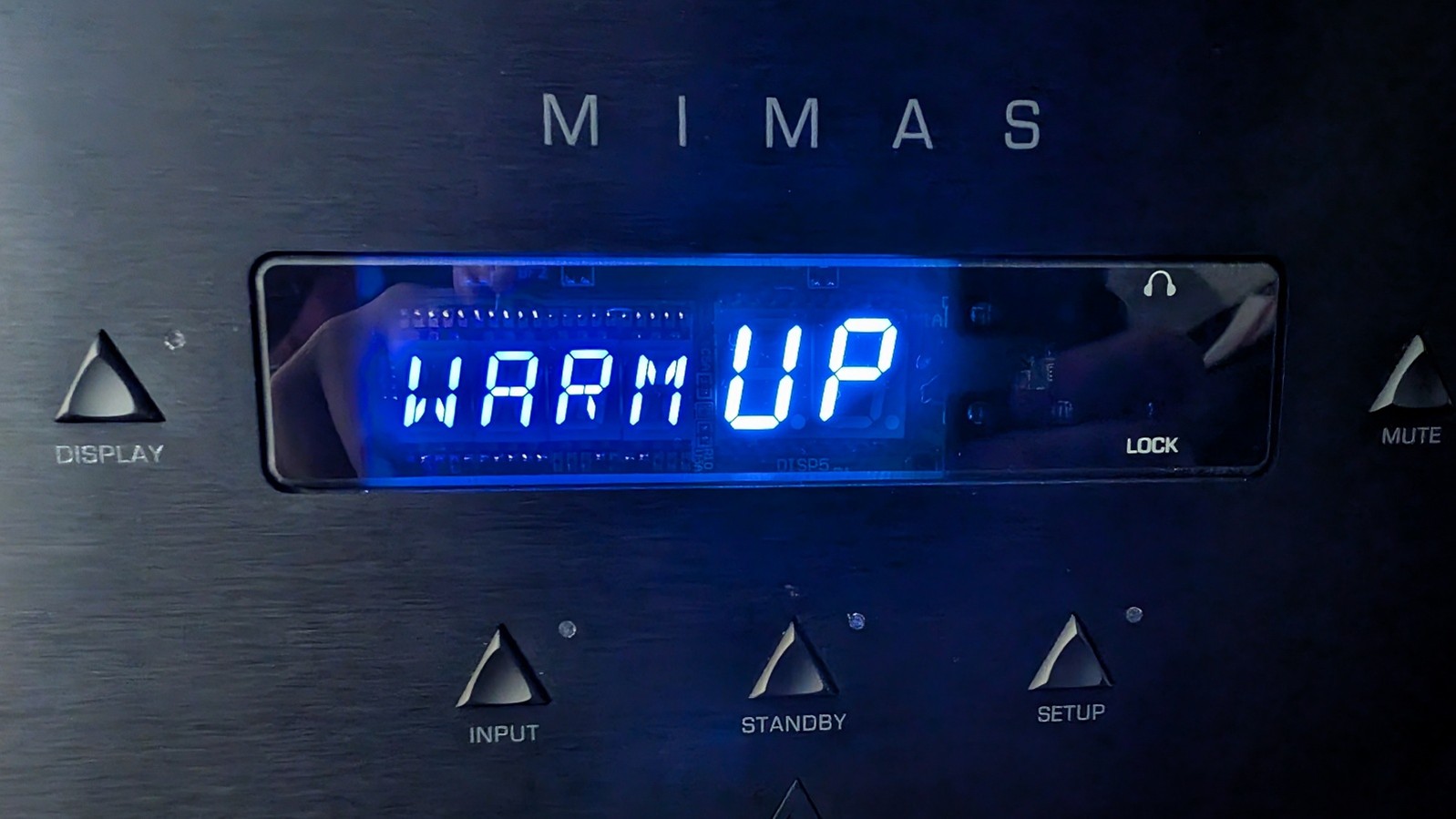 Trecând la primele impresii despre Mimas, voi vorbi mai întâi despre modul unic în care acest amplificator se prezintă. Încep cu faptul că atunci când îl pornești, nu va porni imediat, ci aparatul se va pre-climatiza, afișând pe ecran:
