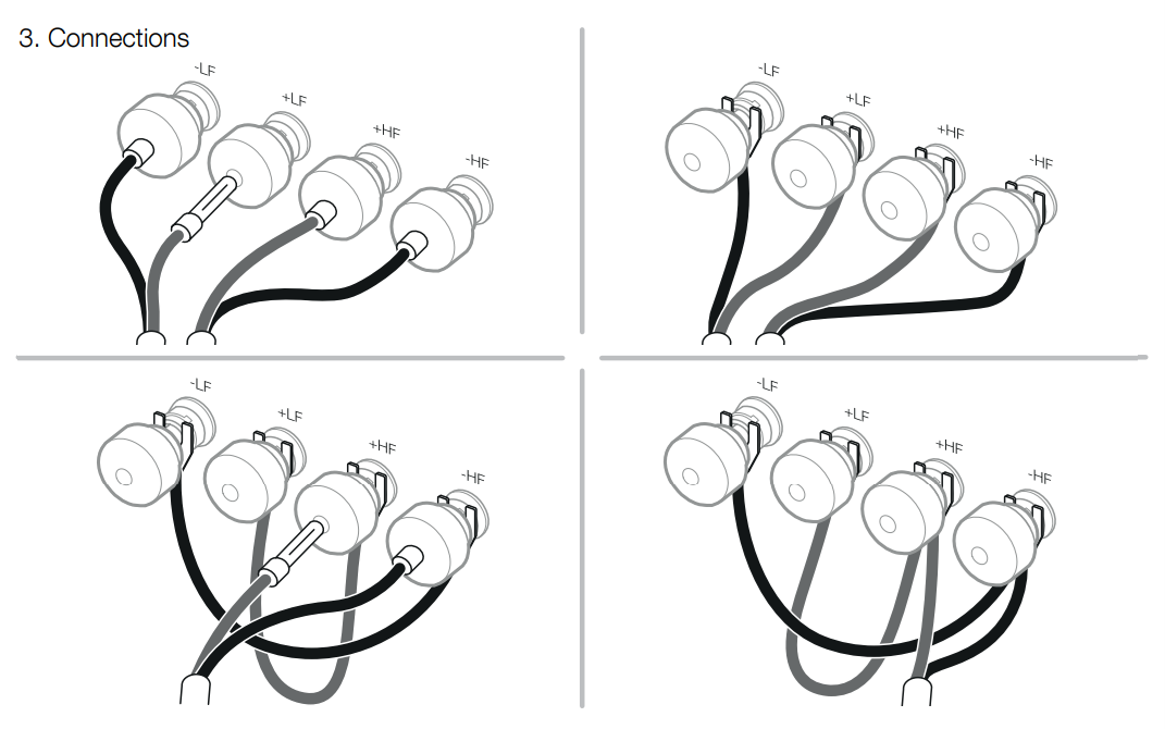 Revenind la cum să conectezi jumperii, îți recomand să încerci două variante și să decizi care se aude cel mai bine la tine: prima implică conectarea cablurilor de boxă la -LF și +LF și mers cu jumperii către +HF și -HF, a doua este fix invers, adică identic cu ce recomandă B&W în manual, în setul de pictograme din partea de jos a imaginii de mai sus: cablul de boxa la +HF și -HF și jumperii către -LF și +LF. Aceste două variante vor avea o influență mare asupra sunetului și este important să determini cum sună mai bine în setup-ul tău. Eu am obținut rezultate mult mai bune cu cablurile de boxă la -LF și +LF, prima variantă de mai sus. În acest fel basul devine mai solid și înaltele devin mai smooth.