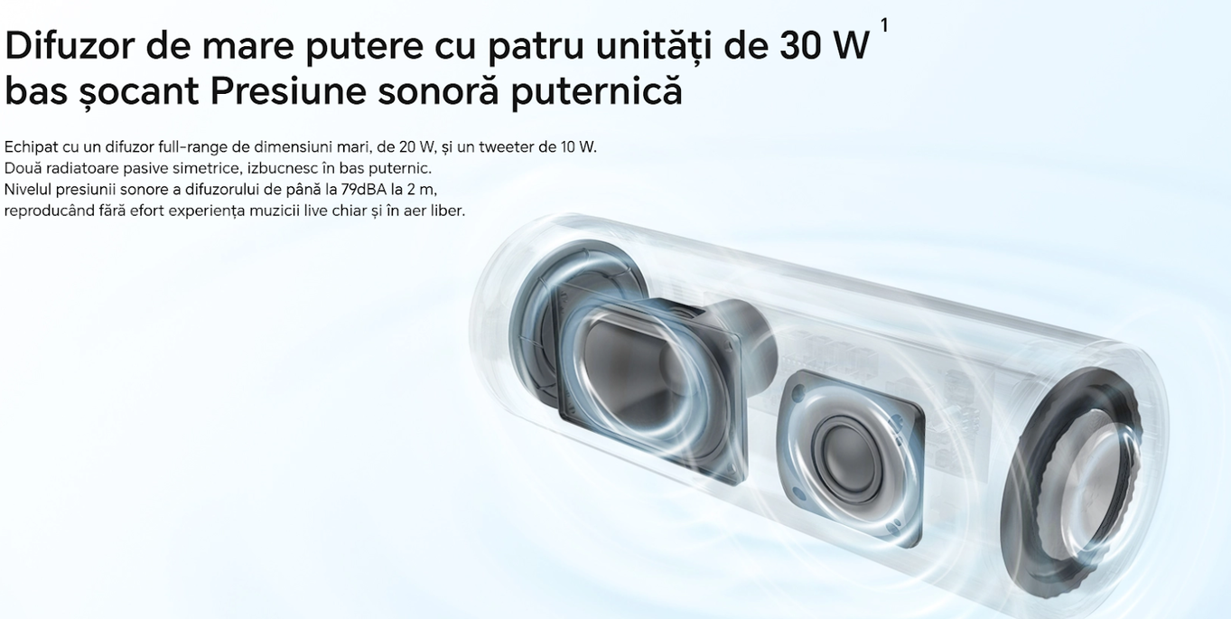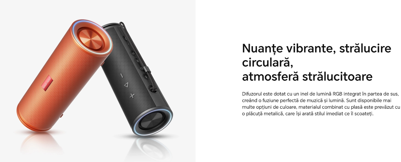 Caracteristici: - Putere: 30 W - Conectivitate: Bluetooth 5.3, port USB-C - Dimensiuni: 7.2 x 21 cm - Sistem: 1.0 - Frecventa de raspuns: 100Hz - 20KHz - Functie TWS (True Wireless Stereo) pentru o experienta audio extinsa - 3 moduri de sunet: Default, Bass Boost si Treble Boost, pentru ajustarea sunetului dupa preferinte - Sensibilitate de intrare: -7 dB - THD: 1% -Raport semnal/zgomot: 80 dB - Indicator LED pentru status - Capacitate baterie: 5200 mAh - Tip baterie: Li-ion - Autonomie baterie: Pana la 12 ore de redare continua - Timp de incarcare: Aproximativ 2 ore - Protectie: IP67, rezistenta la apa si praf - Microfon integrat si functie de apeluri |