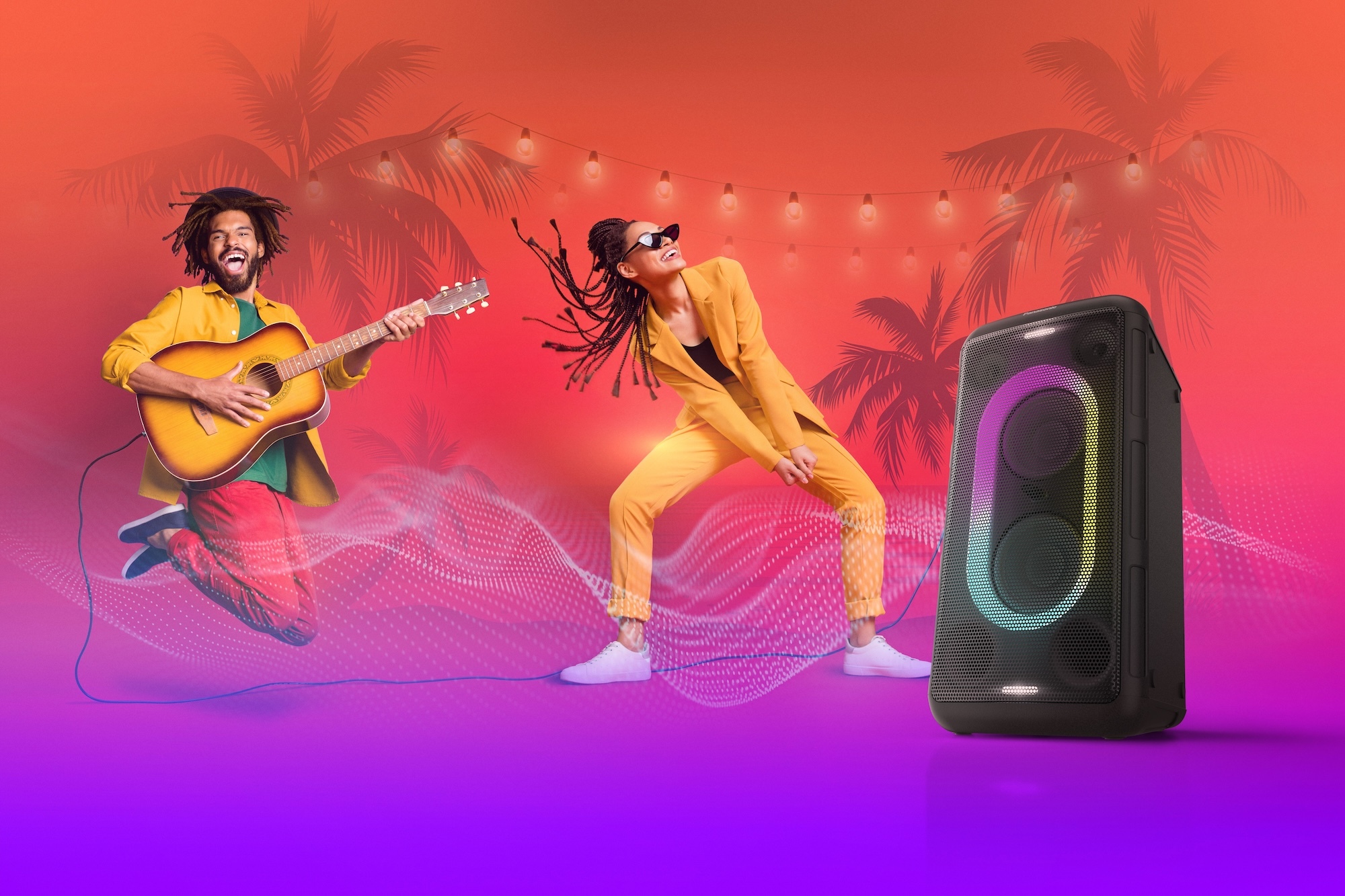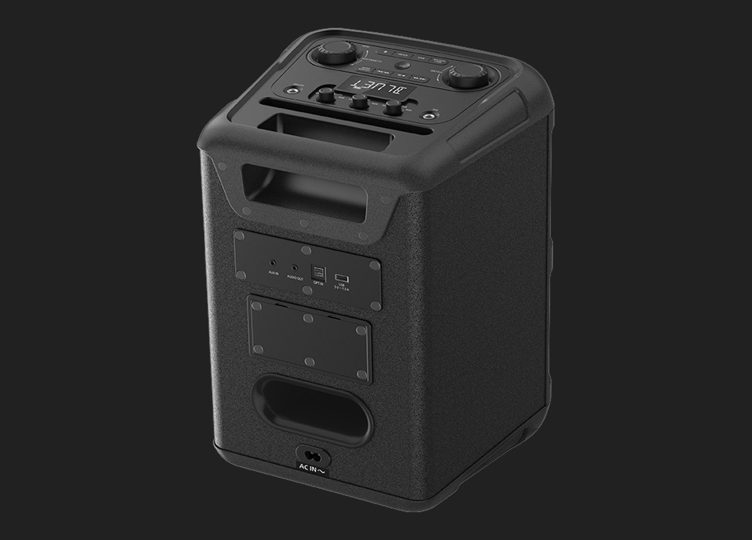 SpecificatiiPutere de petrecere 75 W (75 W AC/25 W baterie) Pana la 9 ore de functionare cu baterie Woofer puternic de 14 cm – cu 2 tweetere si port bas Bine conectat – Bluetooth, intrare AUX, USB-A, intrare optica Mic in & Chitar in 7 culori stralucitoare cu 12 modele de iluminare diferite