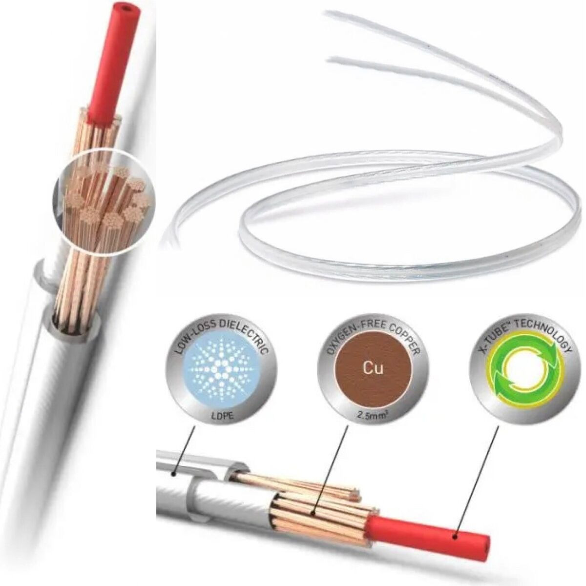 Dielectric cu pierderi reduse În general, nu se apreciază faptul că semnalele electrice care se deplasează cu sau aproape de viteza luminii într-un fir o fac prin intermediul formelor de undă electromagnetice (EM) care există în dielectricul care înconjoară conductorii, precum și în conductorii înșiși. Mișcarea electronilor de-a lungul conductorului facilitează doar generarea formei de undă EM, deoarece „viteza lor de derivă” este de doar câțiva centimetri pe secundă. Prin urmare, este important să se asigure că materialul dielectric utilizat pentru a izola și proteja conductorii centrali ai cablului difuzorului este de un tip care „permite” stabilirea formelor de undă EM fără pierderi apreciabile. Pierderile dielectrice sunt direct proporționale cu „permitivitatea” materialului utilizat și, deoarece aceasta este o măsură a fiecărui material în raport cu cea din vid, ar trebui să fie cât mai aproape de unitate posibil. La fel ca predecesoarele sale, XT25 utilizează un dielectric de polietilenă de joasă densitate (LDPE) special formulat, care, la 1,69, are cea mai mică permitivitate relativă disponibilă practic. Cercetările QED au arătat că, în testele de ascultare, cablurile cu capacitate redusă sunt în general preferate față de cele cu capacitate mare, de obicei pentru că s-au utilizat dielectrici cu pierderi reduse. Utilizarea LDPE și controlul atent al distanței dintre conductori au ca rezultat un cablu cu o capacitate pe metru foarte mică și un factor de disipație (tangenta pierderii) de 0,0001 la 10 kHz. |
