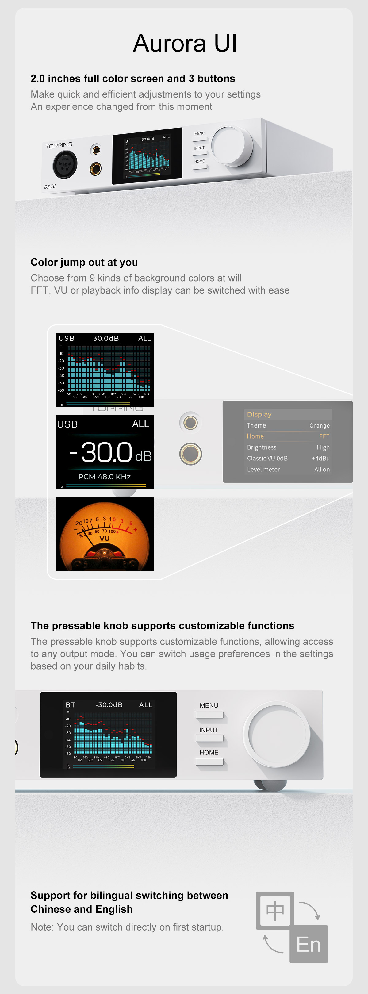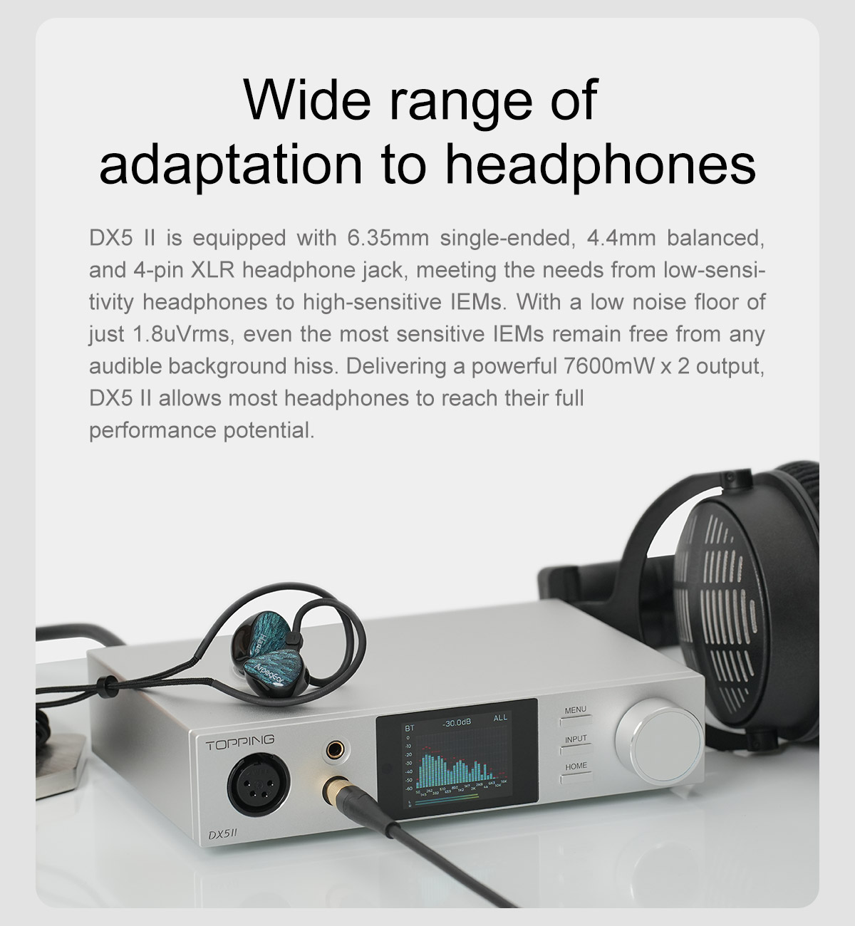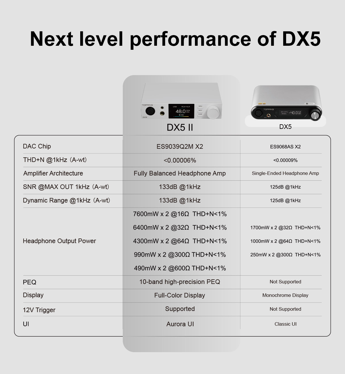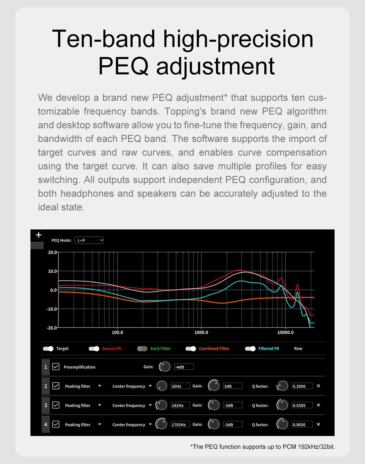Pentru cei care vor să își personalizeze sunetul, Topping DX5 II include un egalizator parametric (PEQ) pe 10 benzi și posibilitatea de a salva profiluri audio proprii. Toate acestea sunt completate de un sunet echilibrat, precis și natural, care pune în valoare orice gen muzical.