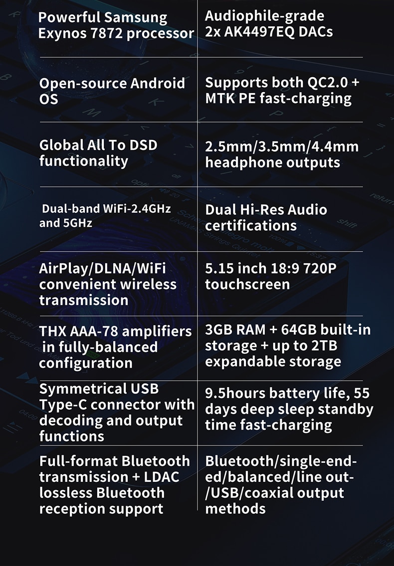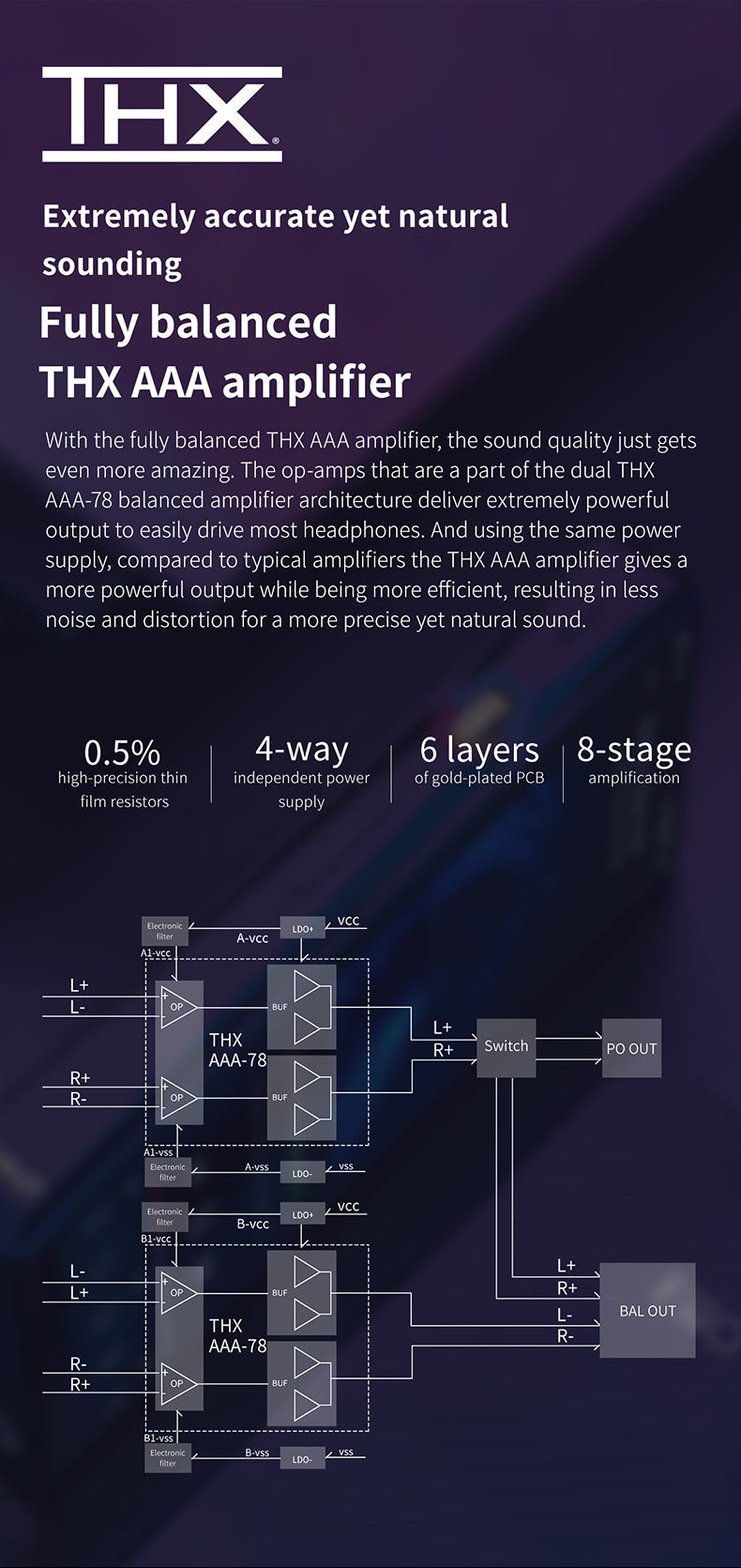 Poate cea mai importanta modificare a variante PRO fata de modelul standard este amplificatorul de casti THX AAA-78, cea mai performata solutie portabila a momentului, acesta oferind semnal balansat pentru conectori 2.5mm TRRS, 4.4mm Pentaconn si 3.5mm nebalansat.