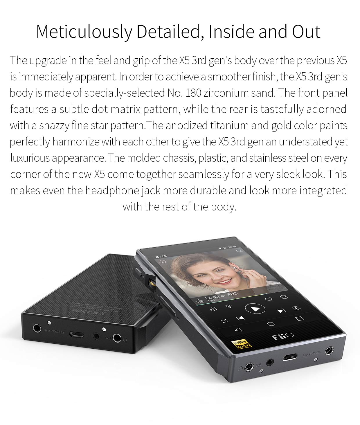 FiiO X5 ajuns la generatia 3 s-a maturizat intr-un player aprope perfect. Design-ul este foarte reusit, materialele sunt de foarte buna calitate, iar sunetul este de-a dreptul impresionant. Se simte foarte bine in mana, extrem de robust, carcasa dintr-o singura bucata de metal transmite calitate. Capacitatea maxima de stocare este enorma, peste 500 de giga de muzica este foarte mutl, choar si pentru cei care au in colectie albume High-res sau DSD. X5 iii are atatea functii utile incat poate fi inima unui sistem audio indiferent de configuratie. Poate fi player portabil, DAC, placa de sunet USB, transport digital, streamer de retea, streamer internet si un excelent player bluetooth cu aptX. FiiO au lovit bine cu noul player, acesta va fi cu siguranta referinta pentru anii ce urmeaza.