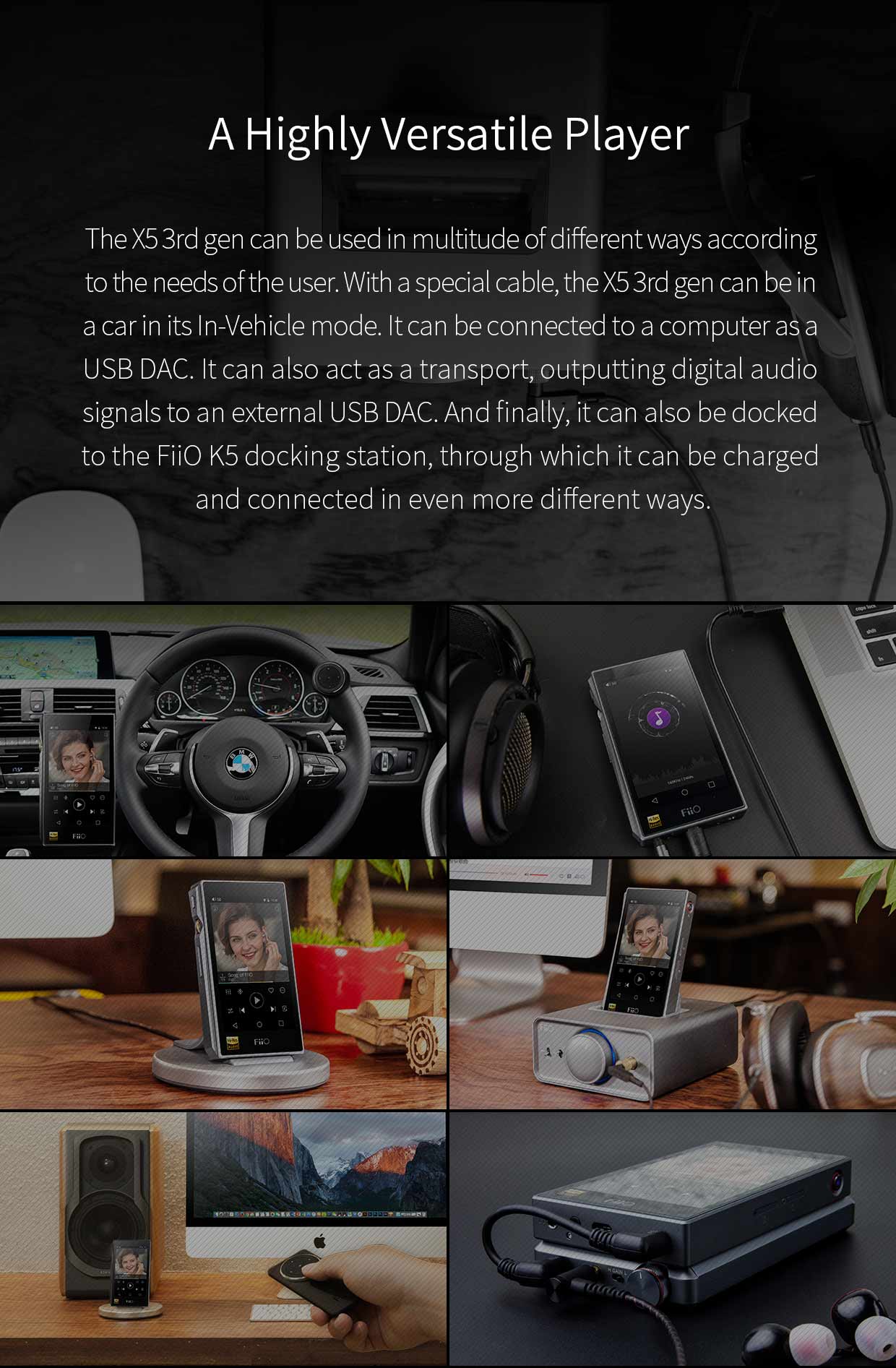Fiio X5 III este un aparat foarte versatil, oferind si functia de DAC USB. Poate fi conectat la PC direct cu un cablu standard USB-microUSB sau cu ajutorul dock-ului Fiio K5. Este compatibil cu sistemele de operare Windows, Mac OS si Linux.