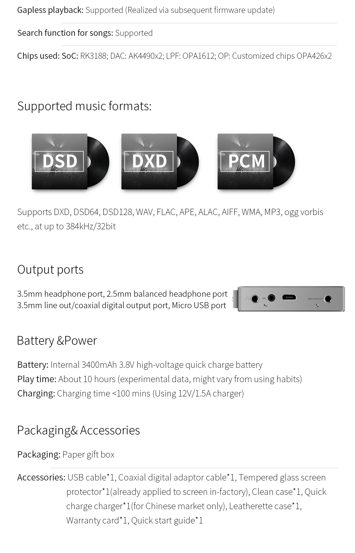 Este foarte placuta senzatia cand il tii in mana, simti ca este greu si rece, ca o bucata de metal masiv. Constructia este de buna calitate, se simte ca un produs premium, iar rotita de volum merge perfect. Dinamica este senzationala fata de orice telefon si chiar fata de playere mai scumpe.Detaliile sunt si ele la locul lor, separarea canalelor este extrem de bine implementata, DAC-urile AKM isi fac treaba la un nivel superior. Merge foarte bine si ca DAC/sursa pentru un sistem stereo cu pretentii. Recomand produsul celor cu adevarat pasionati de sunet de calitate.