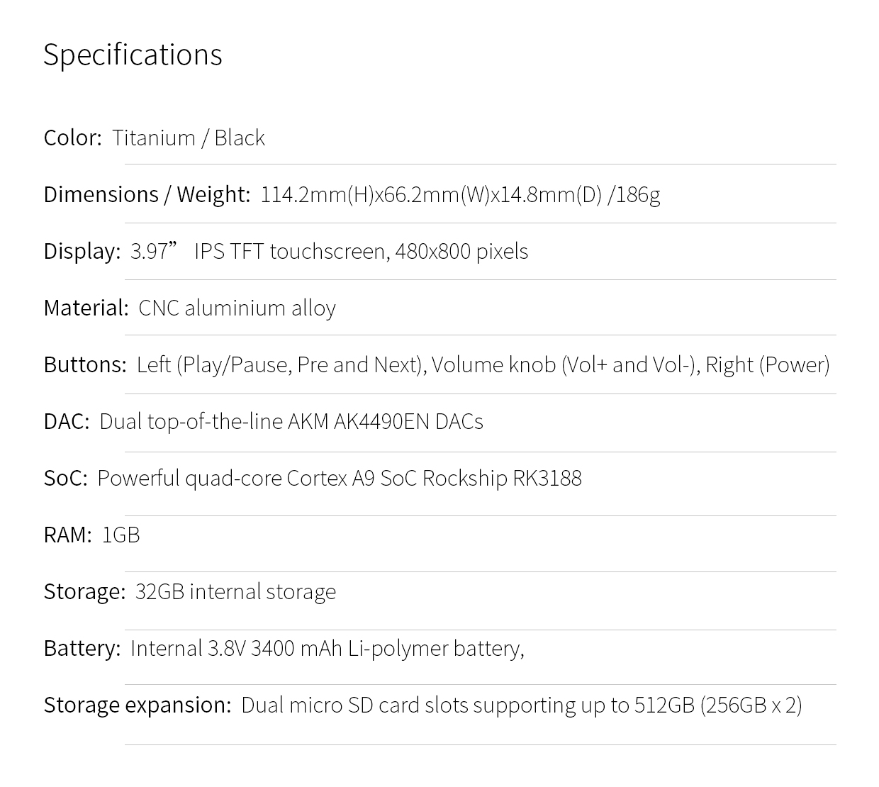 Am aproape un an de când folosesc acest player. La început am folosit numai pe pure music mode, și am fost mulțumit, Îi dădeam nota 8 din 10, chiar mai bine. La un moment dat însă au făcut update la player, și din acel moment au început problemele, mai exact a început să mi se blocheze tot mai frecvent playerul Fiio preinstalat din fabrică. Am încercat alte playere în android mod, și s-a dus fericirea. Androidul se mișcă înfiorător de greu, și dă blocaje foarte des. Am instalat și mi-am activat Tidal Hi-fi. Hardul de sub carcasa în mod clar nu face față, puterea de calcul este mult mai mică decât ar trebui să fie la acest divace și pretențiile pe care le are. Nu am folosit funcția de doc, așa că nu mă pronunț: Așadar, la partea de hardware-nota 4 pentru modulatoarele de sunet pe care susține că le are, în rest e extrem de slab; la partea de sunet: 8 (în privința asta e ok, îl folosesc împreuna cu boxe bosse și căști akg, și sunt mulțumit, destul de departe de Iriver, dar e departe și la preț, ca să fiu cinstit până la capăt; la partea de soft: 5. Playerul preinstalat are o funcționalitate destul de bună, dar se blochează mereu, nu reușește să ducă Tidal, se blochează frecvent. Construcție și finisaje 9. (personal îmi place cum arată). Adică la aspectele care îmi vin acum în minte are o medie de 6.50... Modest spre acceptabil. Principala bubă, ca să spun așa, este este puterea de calcul, mult sub ce ar trebui să fie.