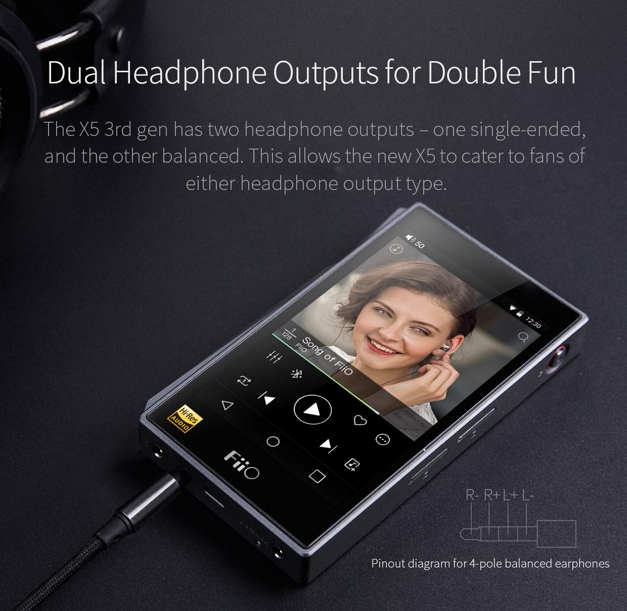 Fiio X5 III poate fi utilizat ca player portabil, ca placa de sunet externa USB (fara driver la MAC, pentru Windows trebuie instalat driver), sau transport digital cu ajutorul conexiunii digitale coaxiala spdif-out. Playerul este dotat cu iesire analogica de casti standard cu jack de 3,5mm si cu iesire de casti balansata cu jack 2,5mm TRRS, ambele amplificate si cu doua trepte de putere selectabile din meniu. X5 III are si iesire analogica fixa de tip line-out.