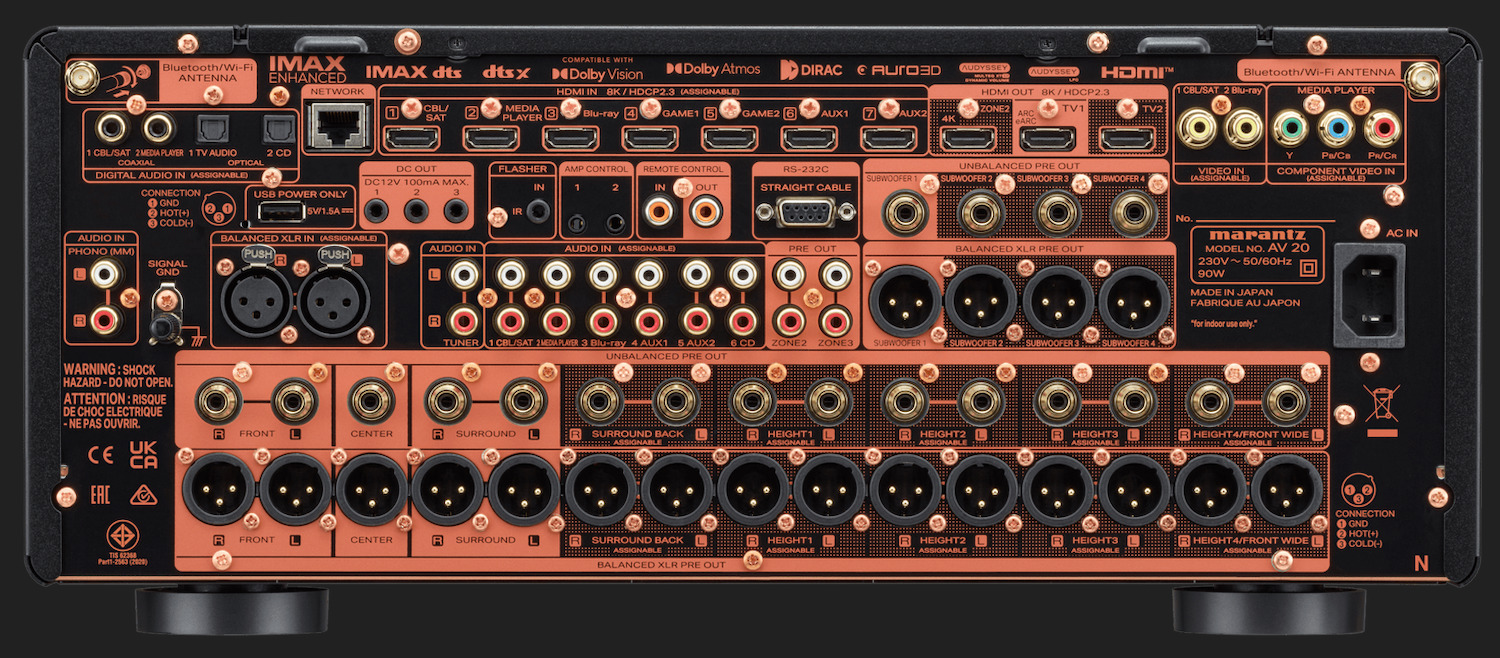 Outputs: 3 x HDMI Out, 2 x Multi-Room Video (Analog), Multichannel Pre-Amp Out (15.4 RCA, 15.4 XLR), 4 x Subwoofer Out (RCA), 1 x XLR
