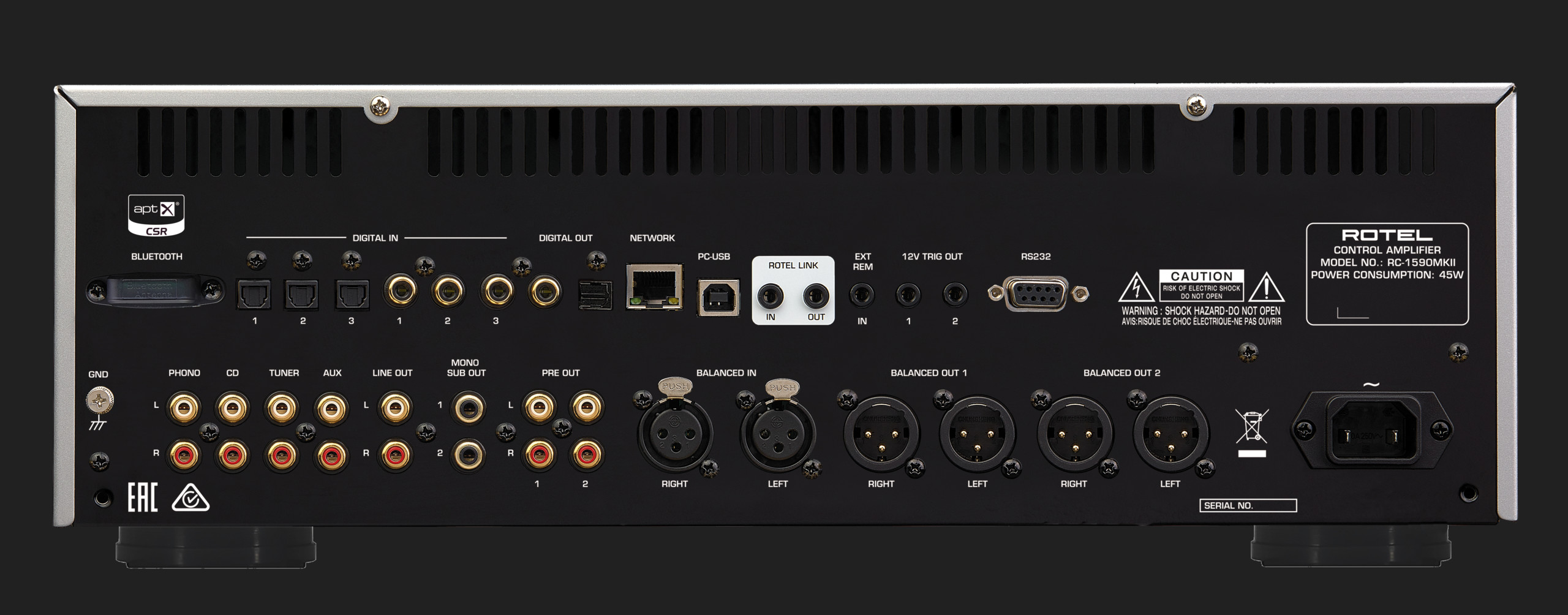 RC-1590MKII suporta un set complet de intrari ce asigura conexiunea la sursele preferate, printre care o intrare Phono MM pentru iubitorii de vinil, intrari analogice, digitale, XLR balansate, Bluetooth wireless aptX™ si AAC de inalta calitate, si PC-USB (32-bit/384kHz) ce suporta MQA.