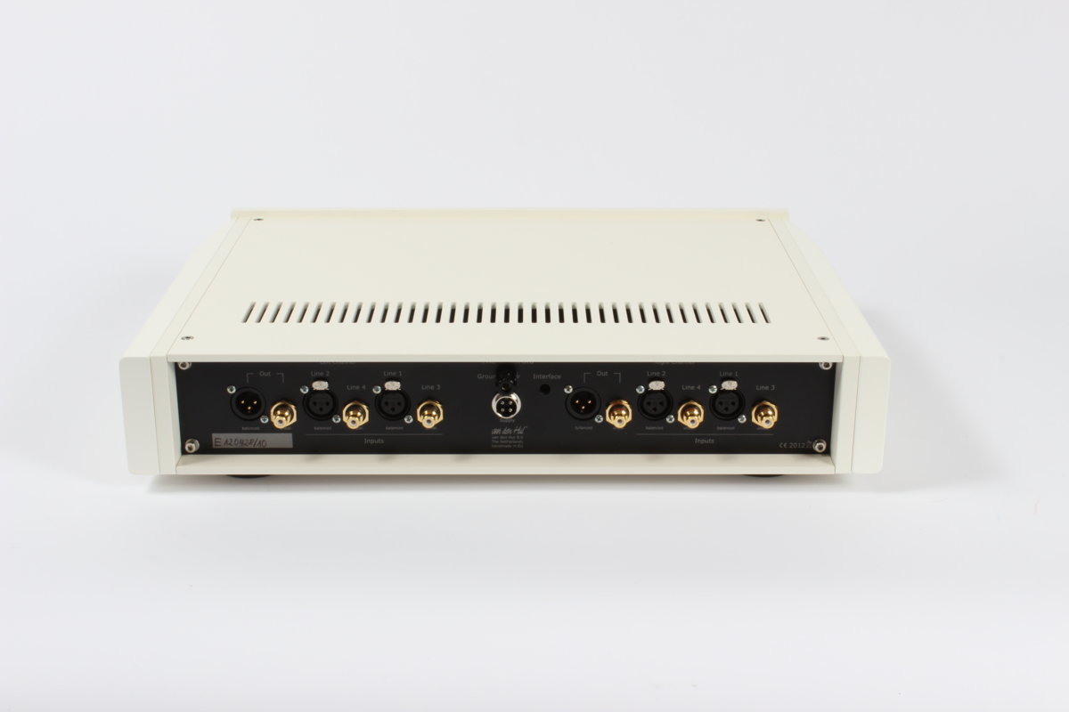 Stereo line-level preamplifier, fully balanced amplifier design with special "accumulator simulation" power supply (ASPS) design. The transformer resides in an external housing.