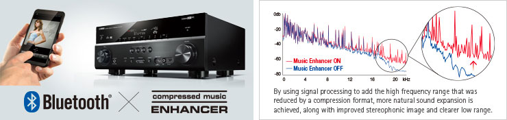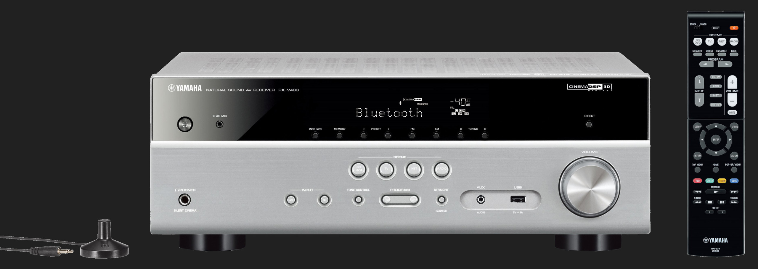Receiverul Rx-V 483 are Bluetooth incorporat. Puteti conecta la el orice telefon mobil sau tableta, iar Yamaha Compressed Music Enhancer este optimizat special pentru Bluetooth, astfel incat sa asigure un sunet clar, puternic si viu.