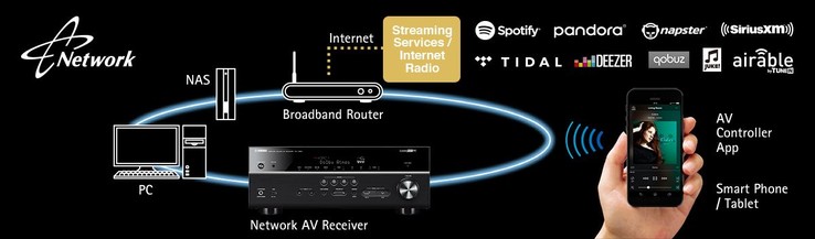 Prin conectarea la internet aveti disponibile o vasta lista de posturi Internet Radio, servicii streaming online precum Spotify® sau muzica stocata pe un PC sau NAS din reteaua locala, prin DLNA sau AirPlay. Aplicatia de control ( iOS sau Android ) permite un control extins al functiilor receiverului direct din dispozitive mobile.