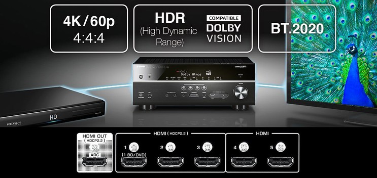 RX-V 483 este adus la zi cu ultimele standarde HDMI®. Puteti vedea imagine 4K fara nici o limitare. Receiverul poate sustine 4K UHD la 60 cadre pe secunda si un gamut extins de culoare BT.2020 , suporta HDR ( High Dynamic Range - tehnologie care imbunatateste contrastul si detaliul imaginii ) - compatibil Dolby Vision. Noul standard copyright HDCP2.2 este disponibil pentru toate conexiunile HDMI, astfel incat suportul pentru noile generatii de playere HD sa fie complet. Acest receiver face doar pass-through, nu poate face upscale din surse inferioare.