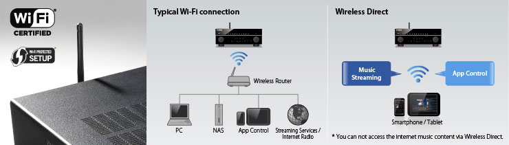 Conexiunea Wi-Fi este integrata in receiver. Puteti sa-l conectati direct la routerul local si sa comunice cu orice alte dispozitive mai sunt conectate in retea. Chiar daca nu este disponibila o retea locala, Wireless Direct permite conectarea directa a receiverului la smartphone sau tableta pentru streaming de muzica sau pentru a-l controla cu aplicatia mobila.