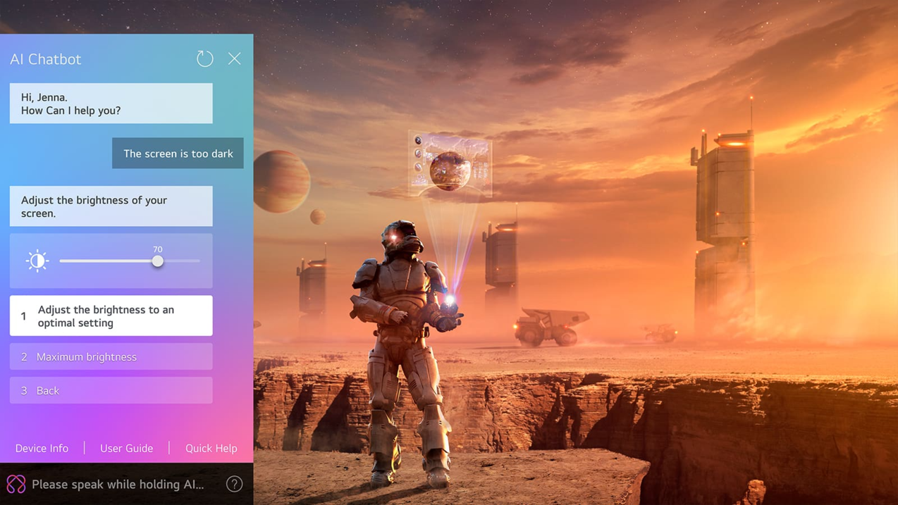 AI Chatbot Ai propriul AI Chatbot care rezolvă activ probleme și care te ajută cu solicitările. Pur și simpu vorbește televizorului, deoarece îți poate clasifica intențiile și poate răspunde în consecință. |