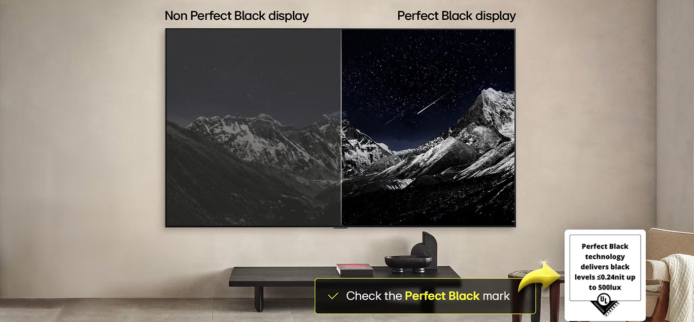 Perfect Black chiar și în spații luminoase sau întunecate Perfect Black este verificat de UL și oferă niveluri autentice de negru, îmbunătățind luminozitatea și contrastul, indiferent dacă te afli într-un mediu luminos sau întunecat. |