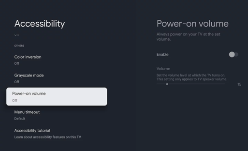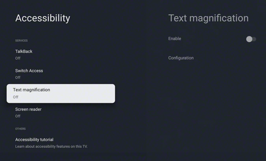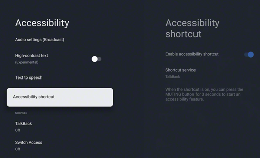 Comandă rapidă accesibilitate Comanda rapidă pentru accesibilitate permite activarea și dezactivarea funcțiilor de accesibilitate rapid și ușor cu o apăsare lungă a butonului de dezactivare a volumului de pe telecomandă. Puteți aloca acestei comenzi rapide o funcție de accesibilitate pe care o utilizați cel mai frecvent. | |